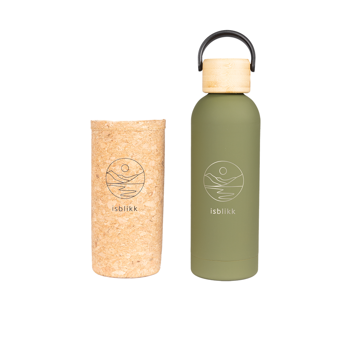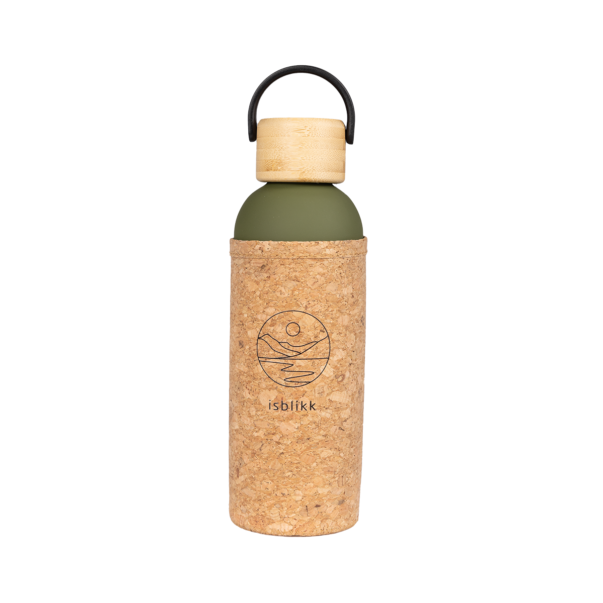 Aluminiumskroppen er trukket med naturlig kork som isolerer mot varme og gir et behagelig grep – perfekt i badstue eller spa. Korken kan også ta av slik at flasken kan rengjøres.